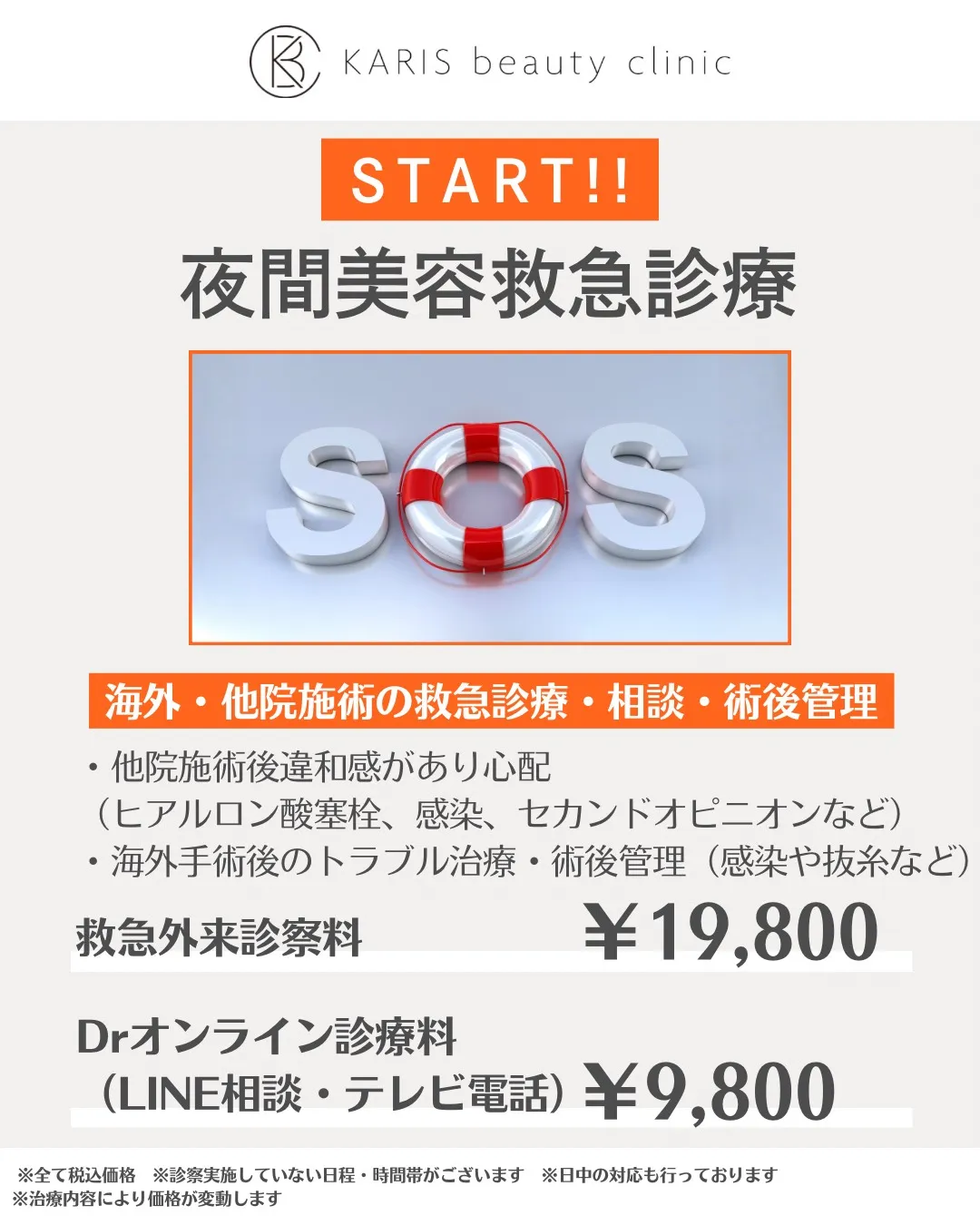 夜間美容救急診療(19:00〜翌10:00) 他院術後管理/セカンドオピニオン